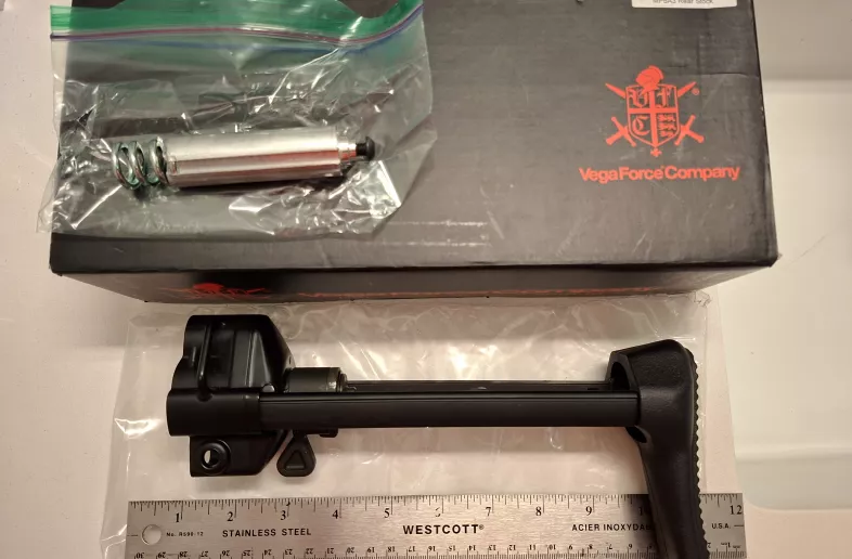 Airsoft Stock is brand new. Recoil spring was removed so it can also fit on a VFC AEG MP5.