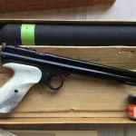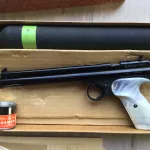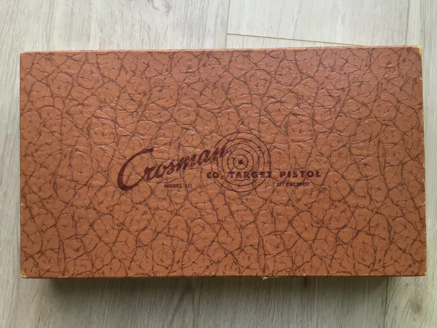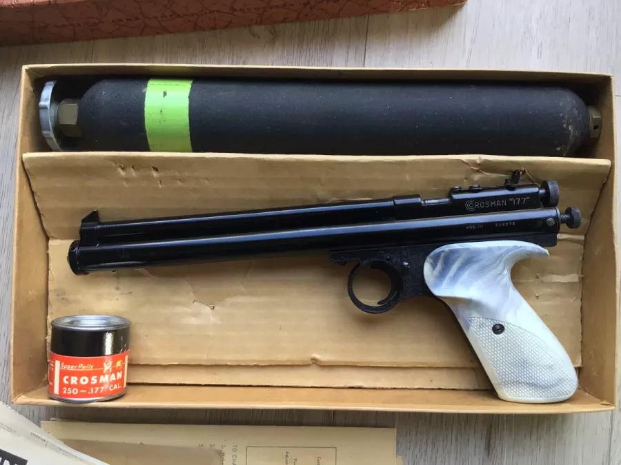 Gun is near new condition with some finish loss on barrel. Has the desirable blue and white swirl grips. It has never been resealed and still holds indefinitely after 70 years. Box is solid no torn corners but there is a small tear in the front flap, Co2 tank is a little rough but is holding pressure. Comes with a plethora of paper work, original manual and advertisements. Yes folks, Crosman used to give away cars. I have owned this one for over 20 years and it just sits in storage, time to pass it on. Price includes shipping