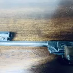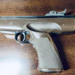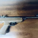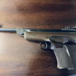 The dark brown plastic grip is an extension of the pistol’s stock that houses the entire barreled action. It is one piece and features coarse checkering all around the grip. And there is a thumbrest on the left side because, as you know, until around 1990, everyone was right-handed.