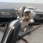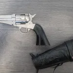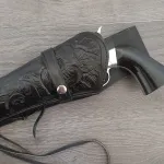Comes with left-handed, black leather holster.