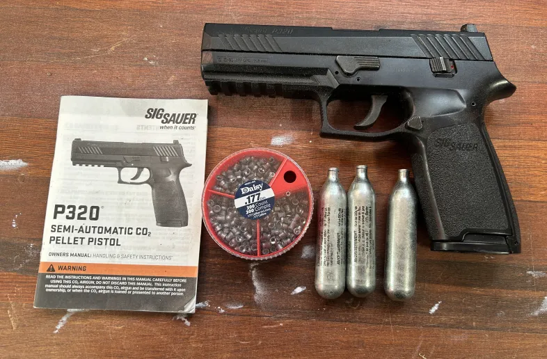 Sig P320 blowback CO2 air pistol. In good shape, comes with manual, pellets and some CO2 cartridges.