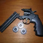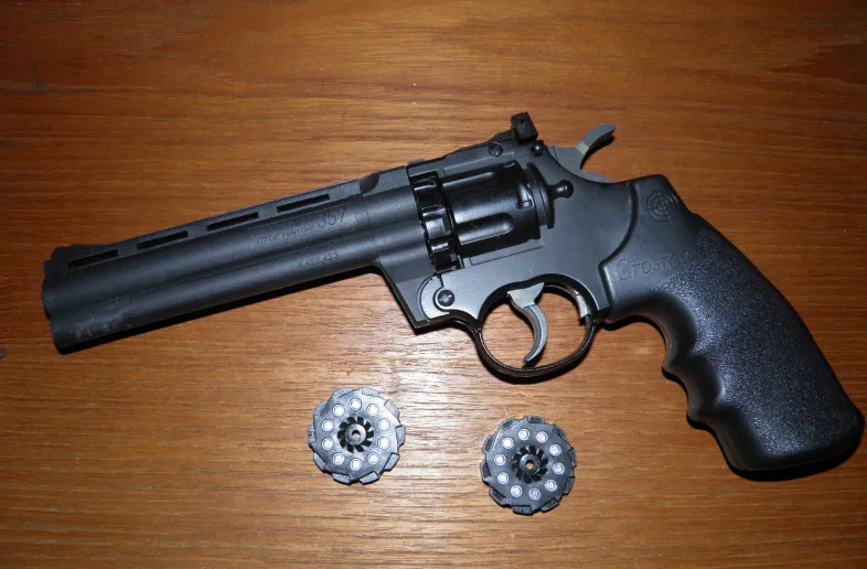 This is an older Crosman air pistol that I bought years ago and have barely used. Probably shot maybe 25 times. It is older so may need a new seal if it is dried out. There is no model number stamped on it. Only 357. I will include 2 extra revolving mags and I will supply 4 air cylinders with purchase..
