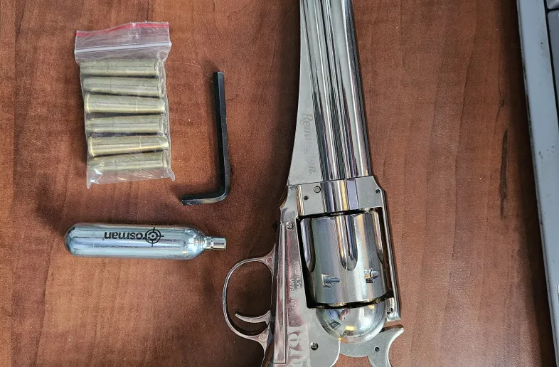 Remington 1875 revolver replica, 4.5mm/.177 BB/Pellet hand gun made by Crosman. Revolver is in mint condition, functions very well, shoots at approximately 400 feet per second. Comes with a box of BBs, a CO2 cylinder and another set of loadable "bullets" in which the BBs go(plus the 6 that come with the gun, for a total of 12 pcs). Geels great in the hand and very realistic. Everything for $150, first with cash takes it home. No Trades, no shipping, only local South Manitoba deals. No Gunpost messages, only text or call (204)290-9085 No license required.