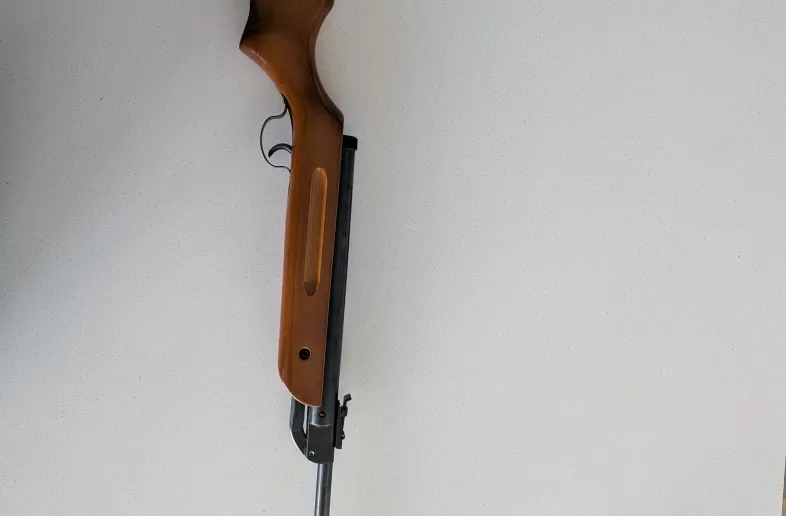 Chinese break barrel pellet rifle in .177 cal. not sure on the model, it's a b1 or something similar. Works, needs a cleaning. In good condition, but the trigger guard rear screw is loose and doesn't screw in all the way. Could probably be drilled and tapped with a bigger screw.