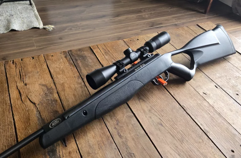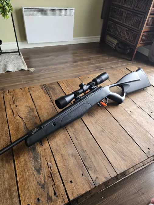 F11 nitro piston with a burris 3-9×40. 495 fps (non pal) works great, comes with about 200 mixed pellets
