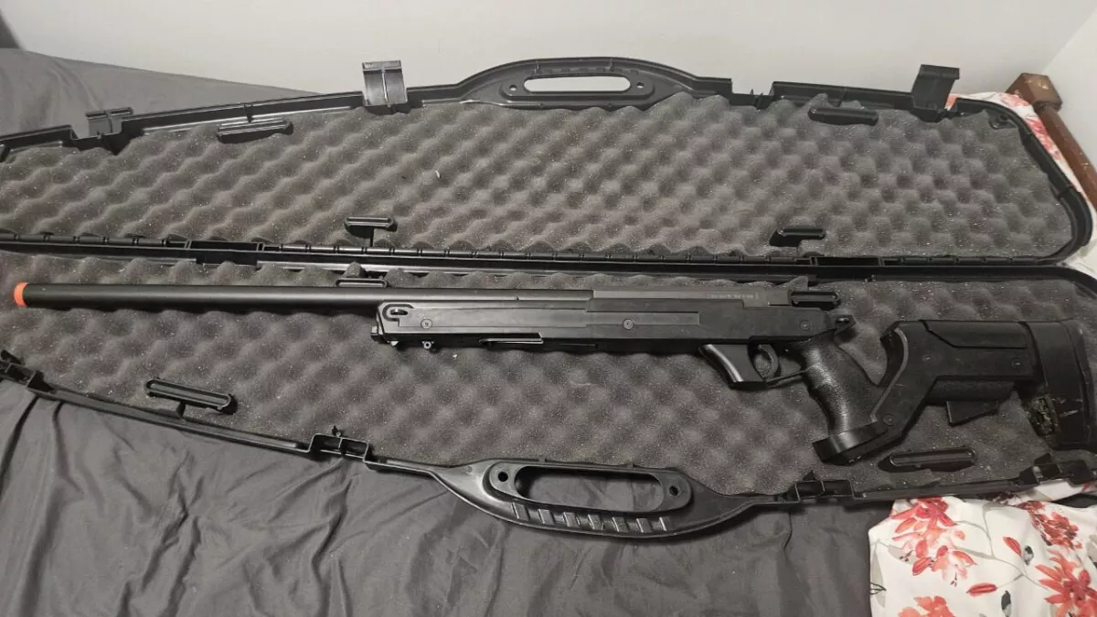 MB-05 Airsoft Sniper Rifle, shoots well at 440-460 FPS. Missing upper rail, and stock adjust.