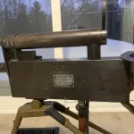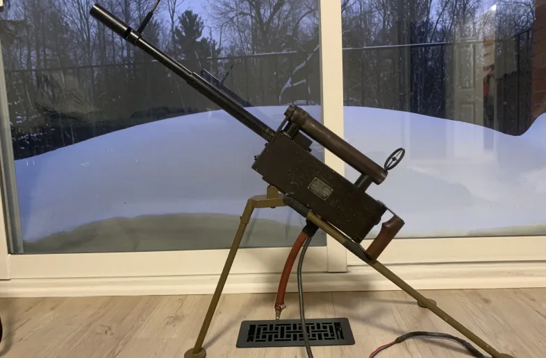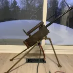 These were used as trainers for new recruits during WW2 to teach them how to lead their target. Due to the expense and demand of real ammo at the time these were an economical alternative. This is the desirable model E-3 Navy Variant. With copper plated barrel shroud that is painted black, spade grips, ring rear site with crosshairs, horizontal magazine and it is 100% fully functional. There are only 10 known specimens. The metal has patina due to its use and age. Comes with what looks like a homemade tripod. This gun will require a 12 volt battery and an air compressor to operate. It will come fully loaded with BB’s. Anything you need to know about these pieces of WW2 history can be found at macglashanbbgun.com Price includes shipping and as with all my guns, don’t be afraid to shoot me an offer.