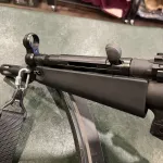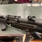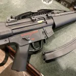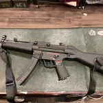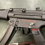 A top Picatinny rail allows easy mounting of red dots or optics while retaining the original iron sights. The rifle uses curved MP5-style airsoft magazines and includes one magazine as shown. A sling is installed and included.
