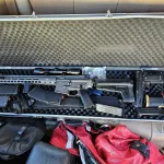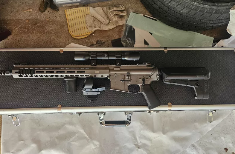 Comes with Centerpoint 4x32mm scope, canted 45 degrees red dot, 3 mid cap (120rnd) mags, vertical mlok hand stop, (no battery included) case included