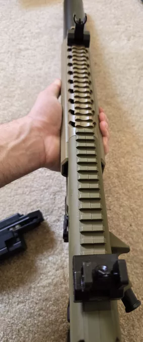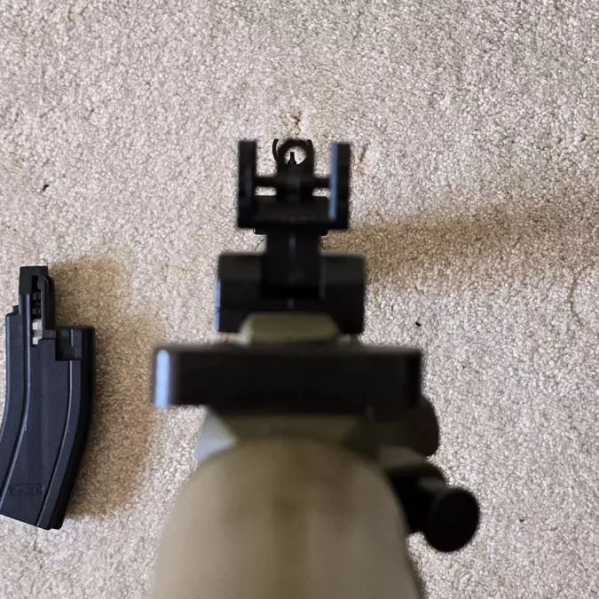 30 round belt fed magazine, adjustable iron sights, AR compatible pistol grip, M-LOK handguard, multitool + a few hundred Crossman .177 pellets (not a full 500. Tin is opened)