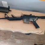 The second one is an M16 style airsoft gun. Multiple parts, like the top rail, adjustable buttstock, and mag are missing, as you can see. But it fires as well.