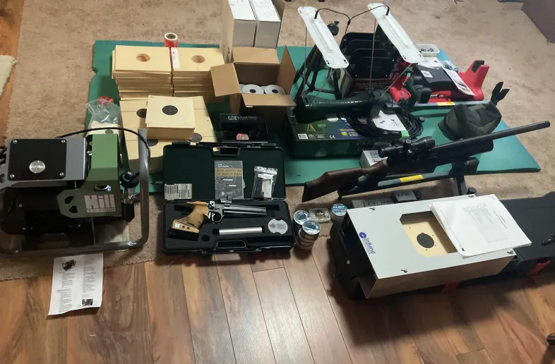 Complete Home shooting package. Everything top of the line in mint condition . Steyr LP50, Kral JumboPuncher rifle, InBand target system, Hill EC-3000 compressor, Caldwell Precision Chronograph Premium, thousands of targets, boxes of spare InBand targets, , thousands of pellets, plus all kinds of miscellaneous parts and accessories including pistol and rifle stands, pellet traps and red dot sights . Literally everything to get into air guns shooting and set up a home range. Well over $15,000 invested. Yours for $7,500.00