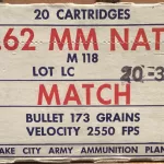 Sealed boxes of 20 rounds of Lake City 7.62 (308) ammo. This match or sniper cartridges remain in as new condition. Dated 1972 headstamp is LC/72/match. All 173 grain velocity 2550 FPS. This is considered to be some of the best match ammo produced used from Viet-Nam to the present time in the M-14. Price per box is $40. 6 available