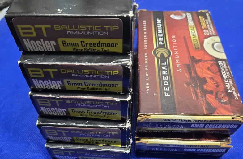 Selling as one lot 7 new boxes of 6mm Creedmoor. 5 boxes are 95 grain bullet ballistic tip hunting ammo and other 2 boxes are match target ammo. 250.00 for the lot. Local sale pick up with valid license