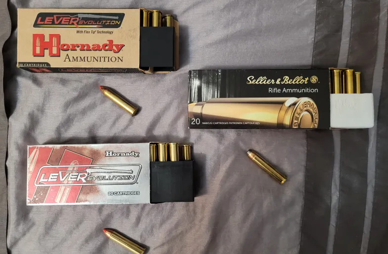 1 box of Hornady 250gr Monoflex, 1 box of Hornady 325gr FXT both Leverevolution ammo, 1 box of Sellier & Bellot 405gr SJSP.