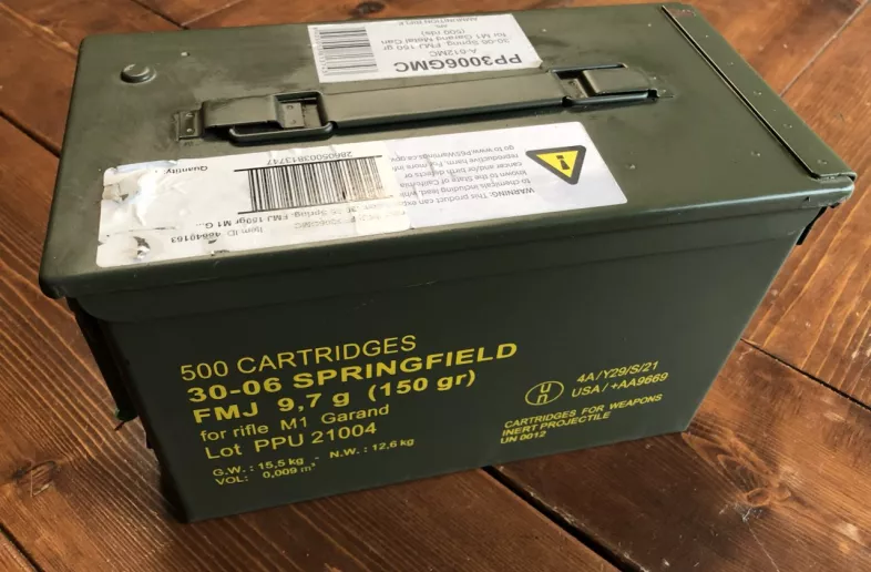 Full case of Prvi Partizan (PPU) .30-06 Springfield — M1 Garand 150-grain FMJ — 500 rounds, supplied in an unopened green ammo can (factory-packed/untampered). New, unfired commercial ammunition — ideal for range use, target practice, or service-rifle feeding where FMJ is appropriate (including rifles chambered in .30-06 and the M1 Garand).