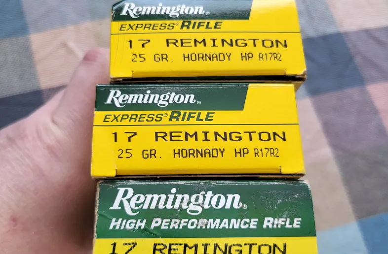 3 boxes, 60rnds total, of 17remington. 2 are hornady HP bullets and 1 box doesnt mention hornady, but all 3 are using 25gr bullets.