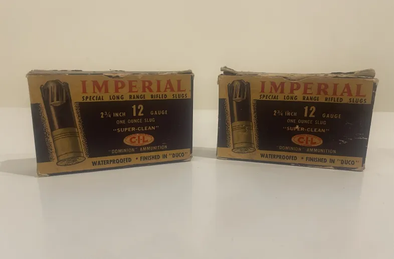 Selling 2 box’s of 1950’s or early 1960’s production Imperial 12 gauge 2 3/4” 1 OZ slugs. Makes a great addition to an ammo collection,
