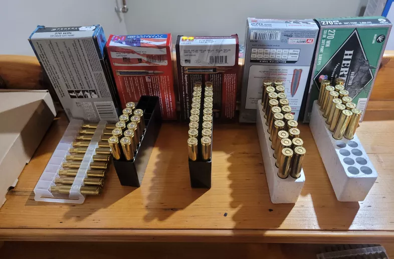 5 boxes of 270 amo. Superformance Hornady 140g full box , Winchester power point 150g full box, federal soft poi t 130g 1/2 box ,Hornady white tail hunter 130g 1/2 box and herters soft point 130g 1/2 box. No longer have 270 rifle.