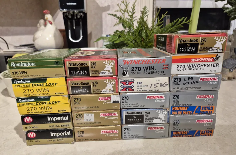 I sold my .270 Win. rifle and discovered that I had amassed a large assortment of factory ammunition. I want to sell ALL AS ONE LOT at $700.00 ($35.00 per box average). All boxes have full 20 rounds except for two Federal 130 grain bonus packs that have 24 rounds in each. The ammunition has all been stored " high and dry" so it's all in excellent condition. I'm in Lloydminster, Alberta and I do not want to ship so buyer to come to Lloydminster. See ad picture for details of each box.