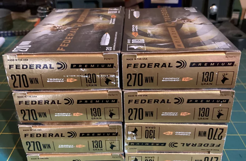 8 boxes of 270 win 130 trophy bonded. $55 per box or $400 for the lot.