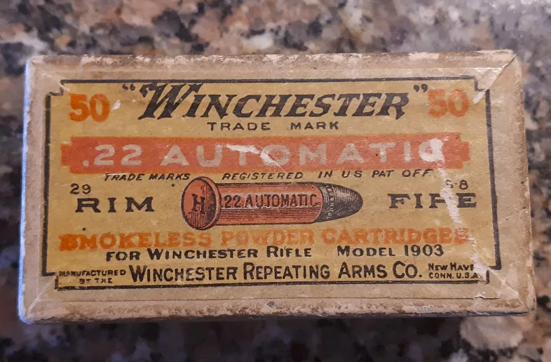 50 round box of Winchester 22 Automatic ammunition for use in Model 1903 Winchester semi auto rifles. The box is in reasonable condition. PAL required, sorry no shipping, pick up only.