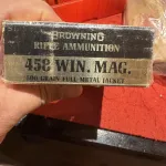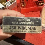 458 Winchester 200.00 Posted: Mar 14, 2026 Address: La Salette, ON, N0E 1H0 Category Ammunition Live Ammo Bullet Diameter .45 cal. Browning box of 458 win , 500gr , from the sixties Visits: 28 Read our Online Safety Tips
