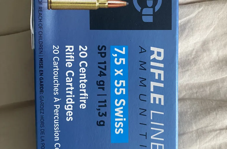 7.5x55 Swiss SP 25.00 Posted: Feb 13, 2026 Address: North Bay, ON, P0h1h0 Category Ammunition Live Ammo Bullet Diameter 7.5 mm Brand new factory box Visits: 27 Read our Online Safety Tips