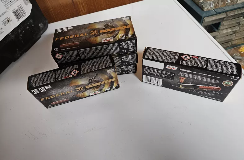 5 boxes of Federal ammo 30-30cal 150 grain. 20 bullets per box