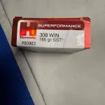 One box of 20 cartridges Hornady Superfomace in 308 Win,165 gr.SST bullets.