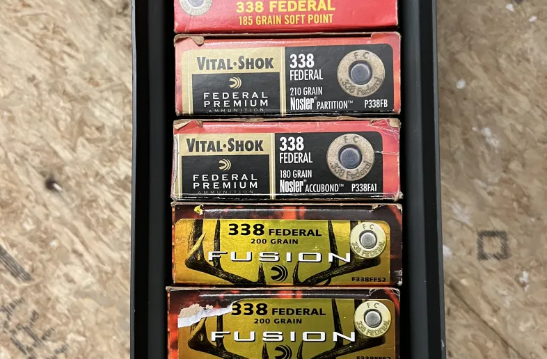 31 rounds - American Eagle, 338 Federal, 185 grain soft points @ $2.00 each, 19 rounds - Federal Premium, 338 Federal,180 grain Nosler partitions @ $3.50 each, and, 60 rounds - Fusion, 338 Federal, 200 grain @ $3.00 each. Total of 110 rounds of .338 Federal ammunition.