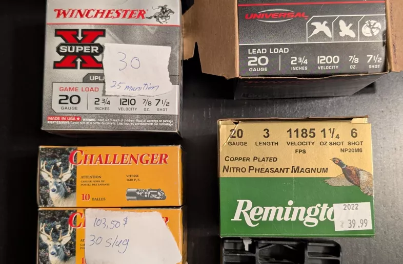 Je n'ai plus de fusil de calibre 20 donc je vends les munitions. Peux être vendu en lot ou séparément. Pas de shipping, PPA requis et Valide.