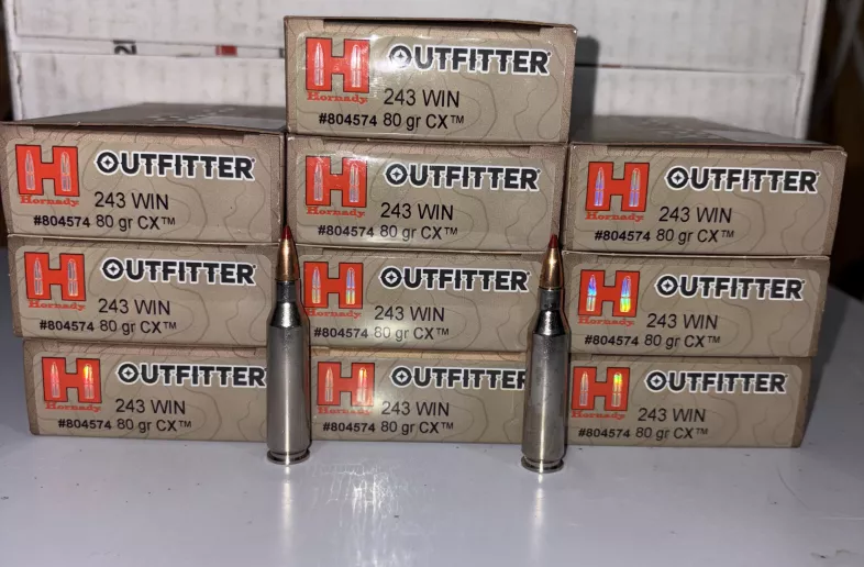 10 boxes of Hornady Outfitter 80 grain CX bullets. Asking $60 a box, no shipping text for fastest reply.