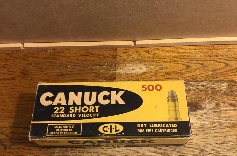 (Vintage) Canuck (CIL) Cal. 22 Short Cartridges. Standard Velocity, Dry Lubricated. Brick (3) Empty boxes on top row, (7) Full Boxes, (350 Cartridges.