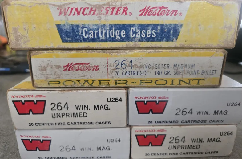 6 boxes of 264 win mag reloads. Believe theyre all 140 gr variety. Load data legible. Selling as components. All boxes full @ 20 rounds. Take 3 or more I'll pay the shipping. Per box shipping on buyer.