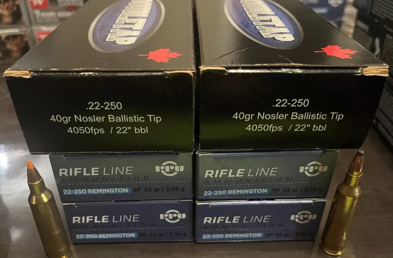 22-250 ammunition, 2 boxes of Doubletap 40 grain Nosler Ballistic Tip. 4 boxes of PPU Rifle Line 55 grain. 230$ for all. Text 705-507-7477 to make arrangements.