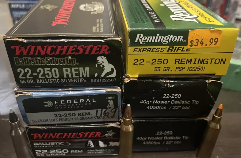 6 mixed boxes of 22-250 ammunition as shown. 1 box of Remington Express, 1 box of Federal Power shok, 2 boxes of Winchester Ballistic Silvertip, and 2 boxes of Doubletap Nosler Ballistic Tip. 260$ for all. Text 705-507-7477 to make arrangements.