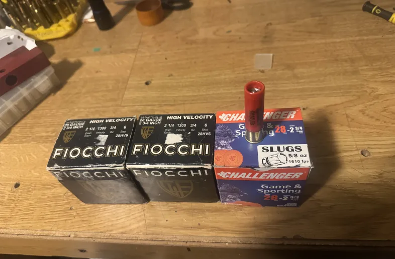 Selling three boxes of 28 calibre ammo two boxes of FIOCCHI 3/4 ounce number 6 1300fps….. one box of 25 really hard to find challenger 5/8 oz slugs…..1610 fps…. $80 firm …. local sale only please