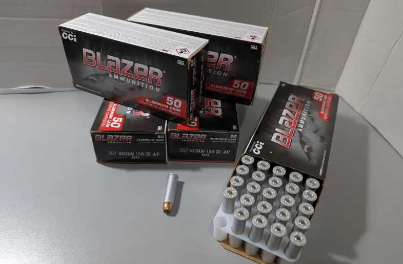 Selling 250 Rds (50 x 5 boxes) CCI Blazer 357 magnum 158 gr JHP aluminum case.