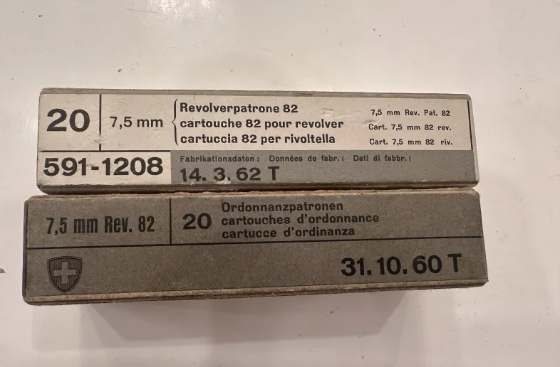 Two boxes of vintage Swiss 7.5 Ordnance ammunition in good condition.