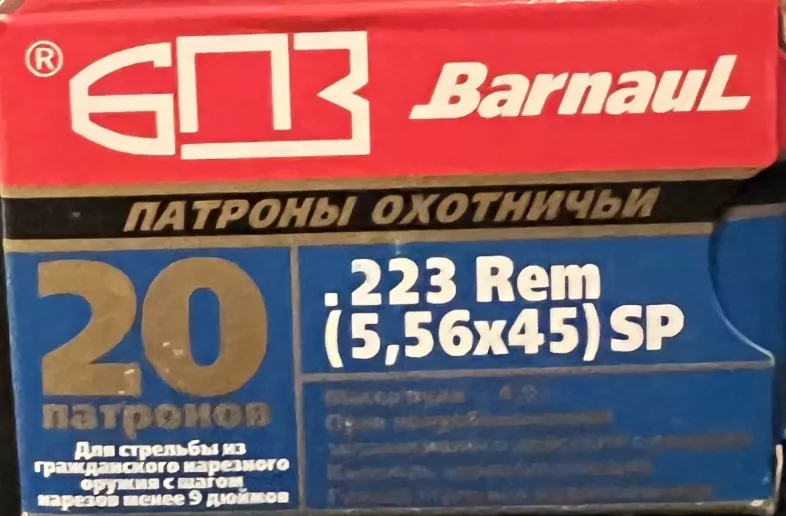 - Barnaul .223 Rem (5.56×45) SP, 62 gr (soft point BT) — 20 boxes (20 rd/box → 400 rounds)