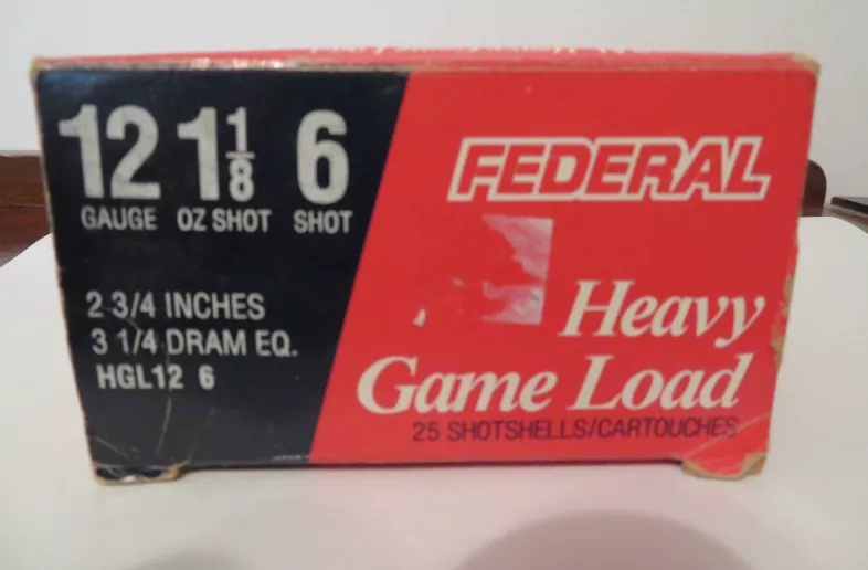 Federal 12 ga 2-3/4" 1-1/8 oz #6 shot Heavy Game Lead Load, 23 rds $10 Also have Winchester 12 ga 2-3/4" 1-1/8 oz #6 Heavy Lead Load, Adv. Velocity 1255 fps good for Grouse and Rabbits etc. 23 rds $15