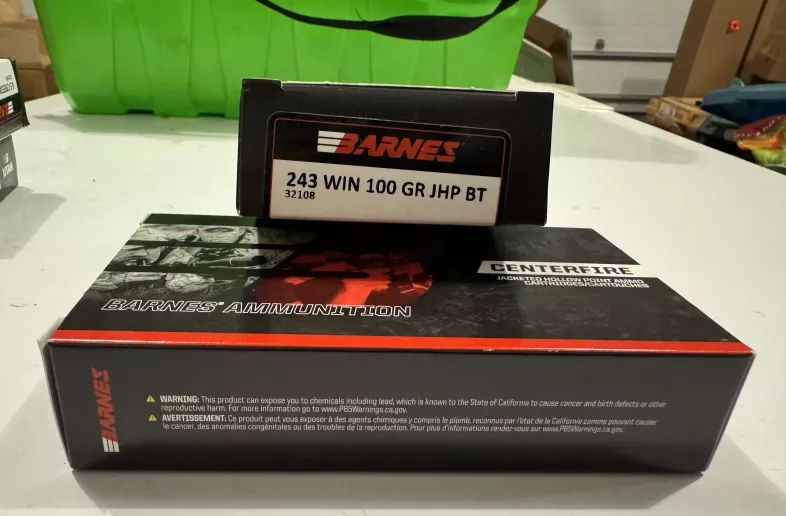 1. Barnes 243Win, 100 grain, Jacketed hollow point- boat tail, 2960 feet per second, 40 bucks per 20 round box.