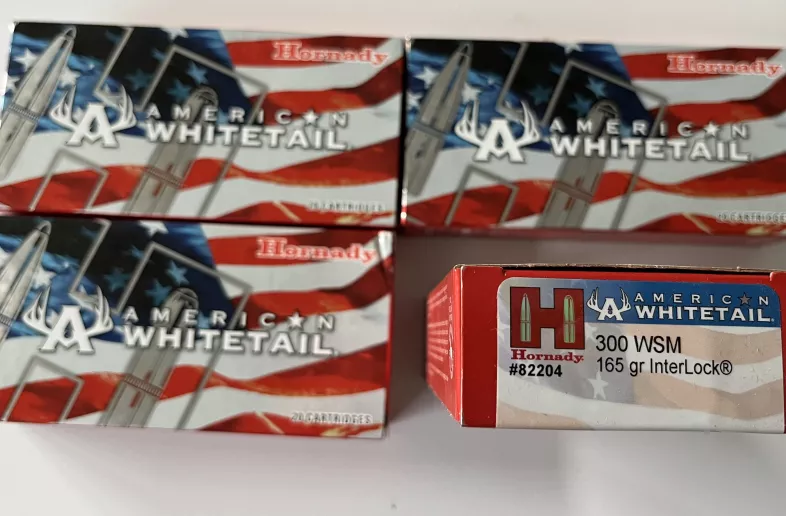 1.Hornady American Whitetail 300WSM, 165 grain InterLock, # 82204, $ 115 for 2 boxes(40 rounds).