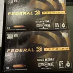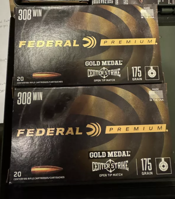 - Federal Premium, 308Win, 175 grain, Gold Medal Center Strike. $85 for 2 boxes(40 rounds).