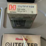 - Hornady Outfitter, 308Win, 165 grain CX ammo, nickel-plated corrosion resistant brass, Polymer Tipped Copper Alloy Expanding bullet, precise hunting ammo. $55 per 20 round box.