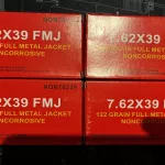 - Norinco red box, 7.62x39, 122 grain, full metal jacket, copper washed steel cased, non-corrosive ammo. $12 per 20 round box.