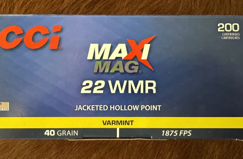 CCI Maxi-Mag, 22 WMR, Jacketed Hollow Point, 40 grain, 1875 feet per second, $23 per 50 round box or $220 per 500 cound case.