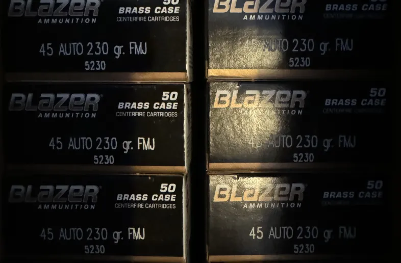 CCI Blazer Ammunition, brass cased, 45ACP, 230 Grain Fill Metal Jacket, $31 per 50 round box or $600 per 1000 round case.