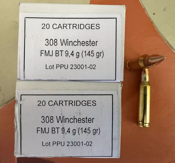 3. PPU 308Win, 145 grain, FMJ- BT ( full metal jacket- boat tail), $ 55 bucks per 40 round(2 boxes).